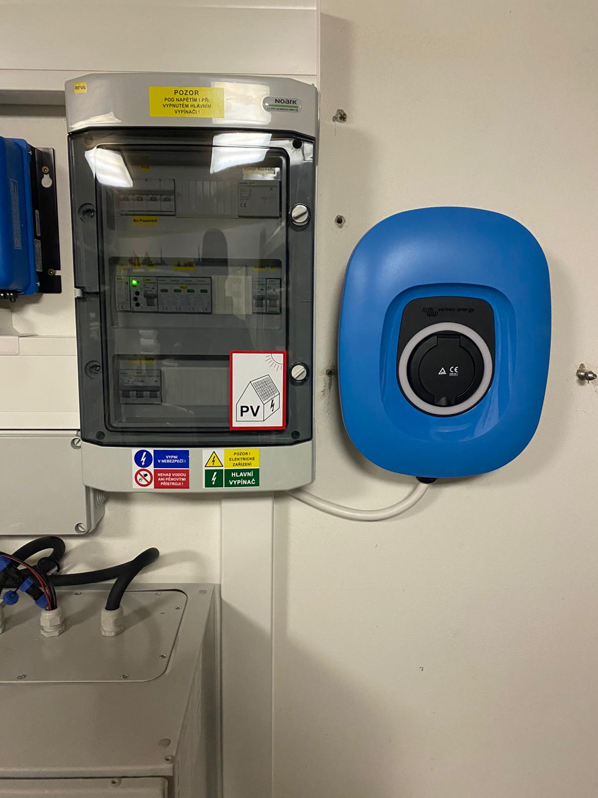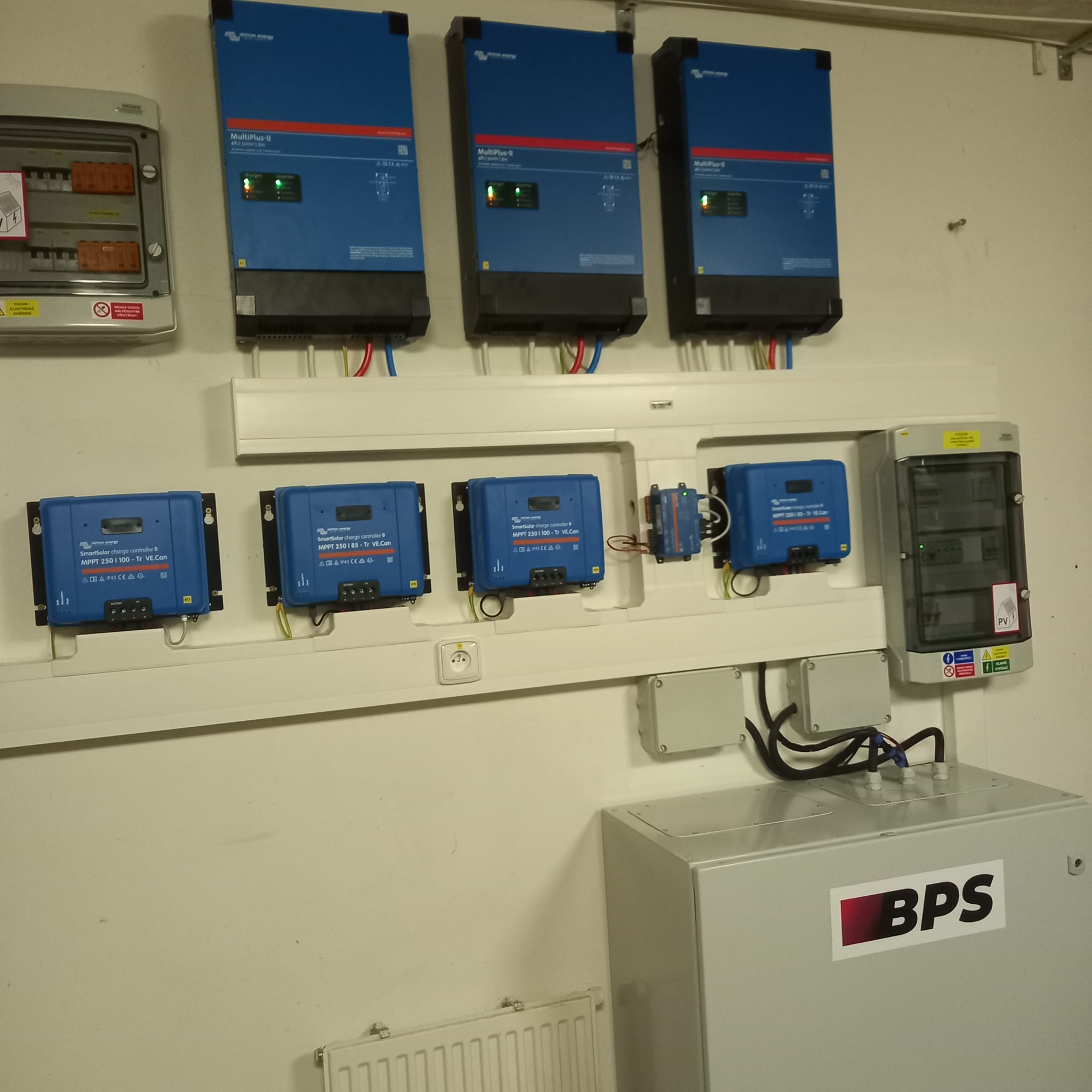 Instalace fotovoltaické elektrárny na sedlové střeše garáže o výkonu 14 kW. Střídače, MPPT regulátor, řídící jednotka Cerbo a dobíjecí stanice pro elektromobily od značky Victron Energy. Bateriové úložiště BPS BATTERY STORAGE o deklarované kapacitě 15 kWh.
