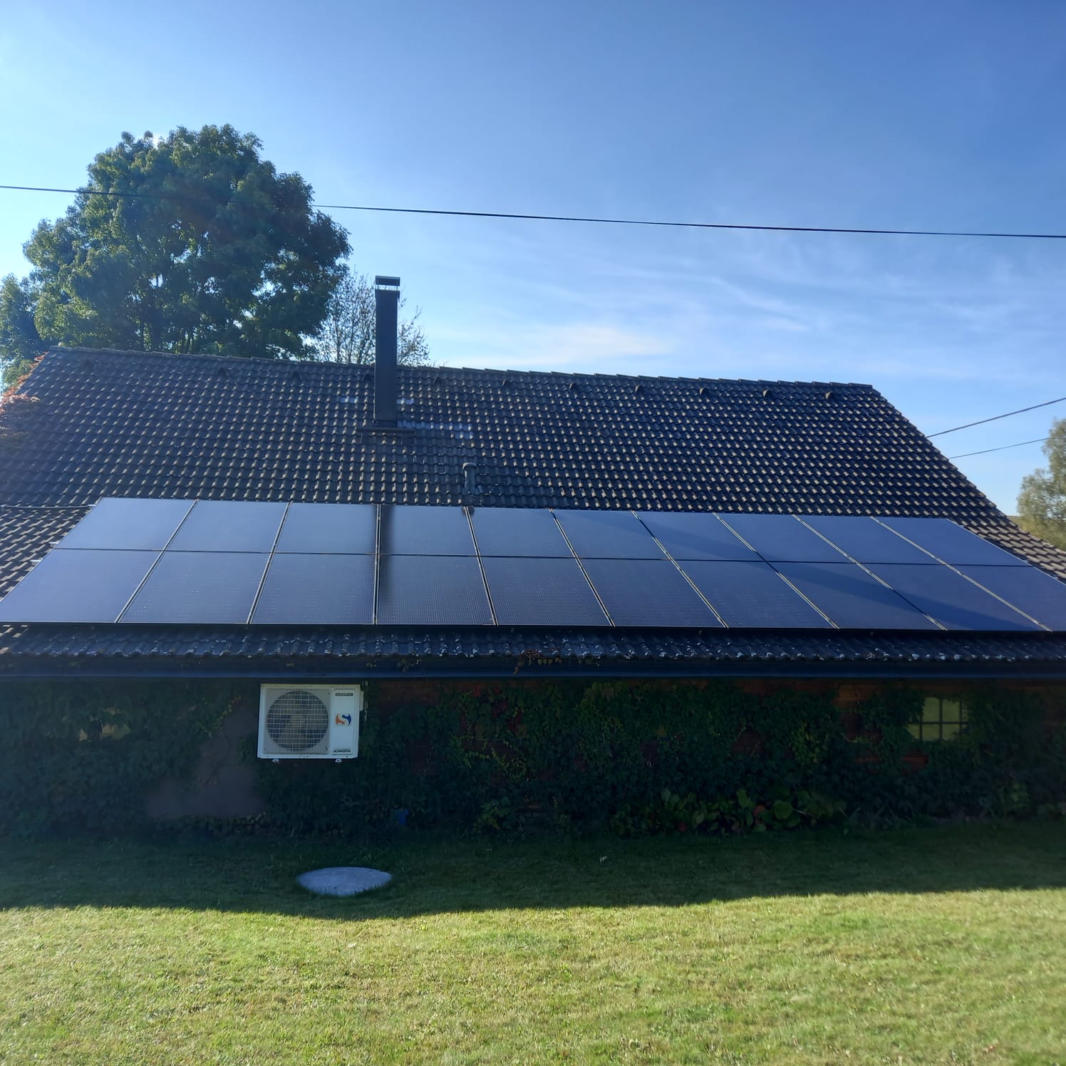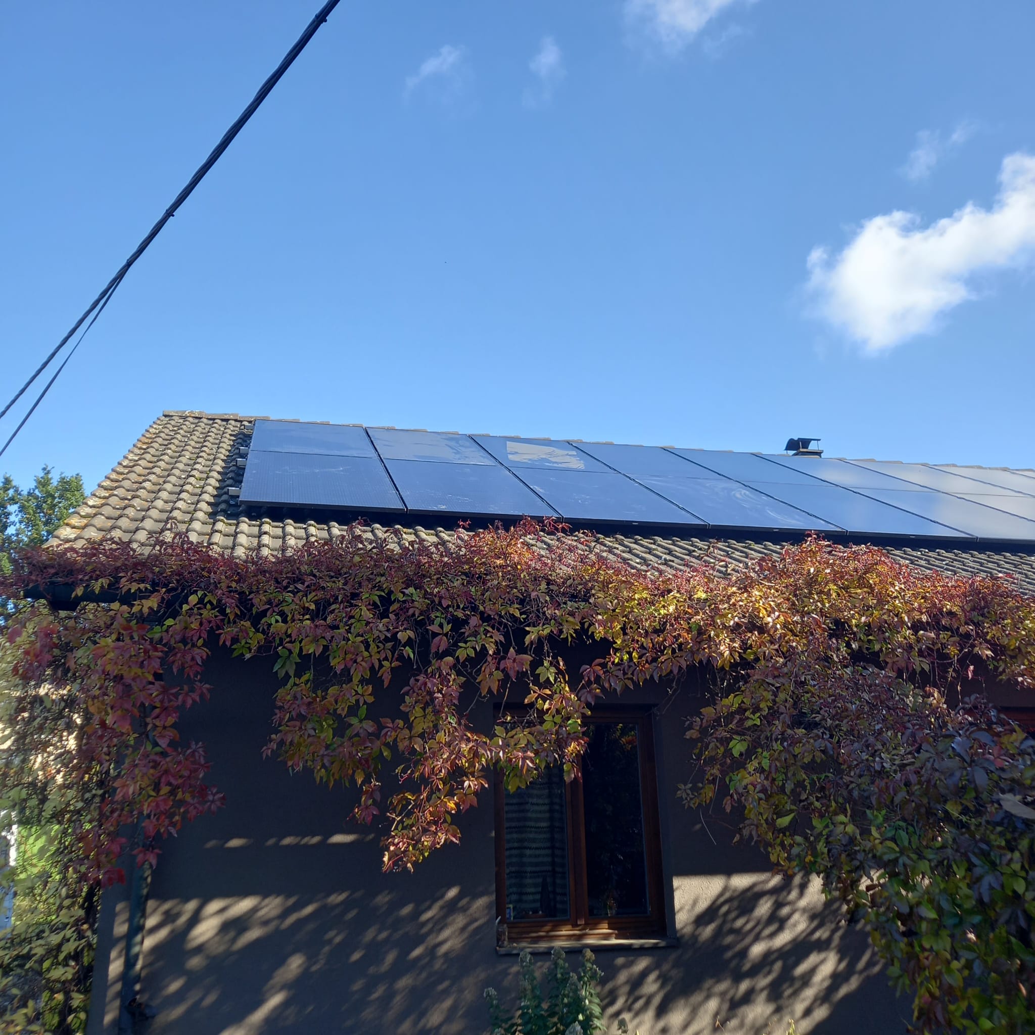 Instalace fotovoltaické elektrárny na sedlové střeše rodinného domu o výkonu 9,45 kW. Střídač 10 kW, bateriové úložiště o deklarované kapacitě 11,6 kWh a dobíjecí stanice pro elektromobily od značky DZD SOLAR.