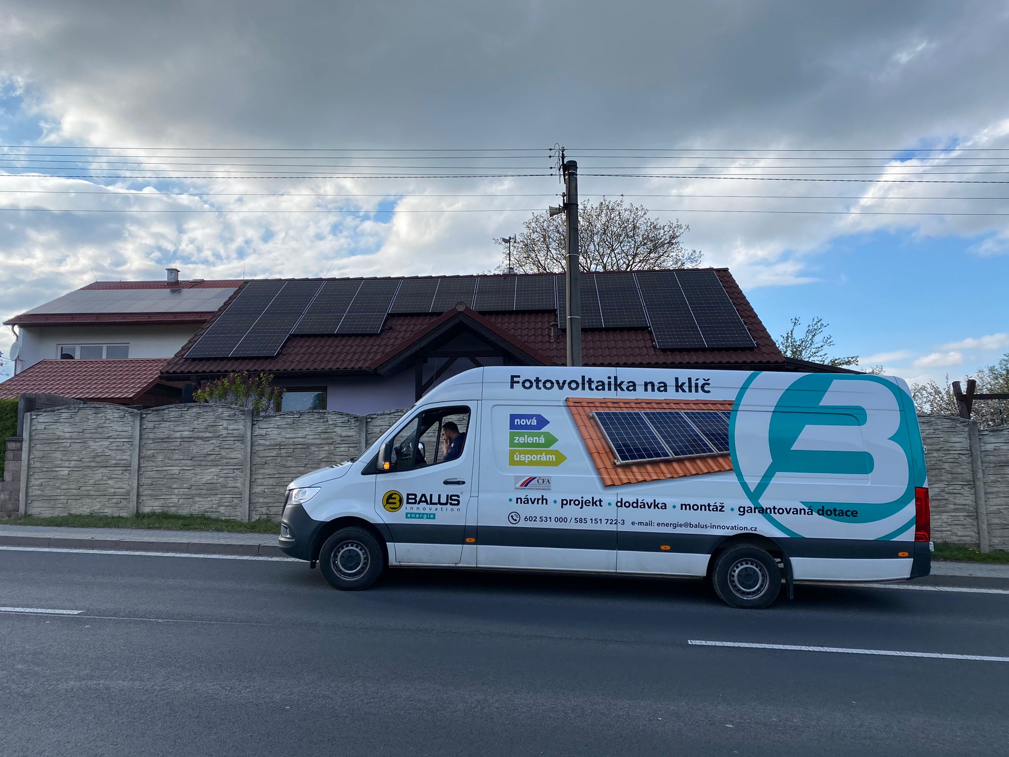 Instalace fotovoltaické elektrárny na sedlové střeše o výkonu 13,2 kW společně se střídačem, baterií o deklarované kapacitě 12,4 kWh a dobíjecí stanicí pro elektromobily DZD SOLAR. Je instalováno i STOP tlačítko pro okamžité vypnutí FVE.