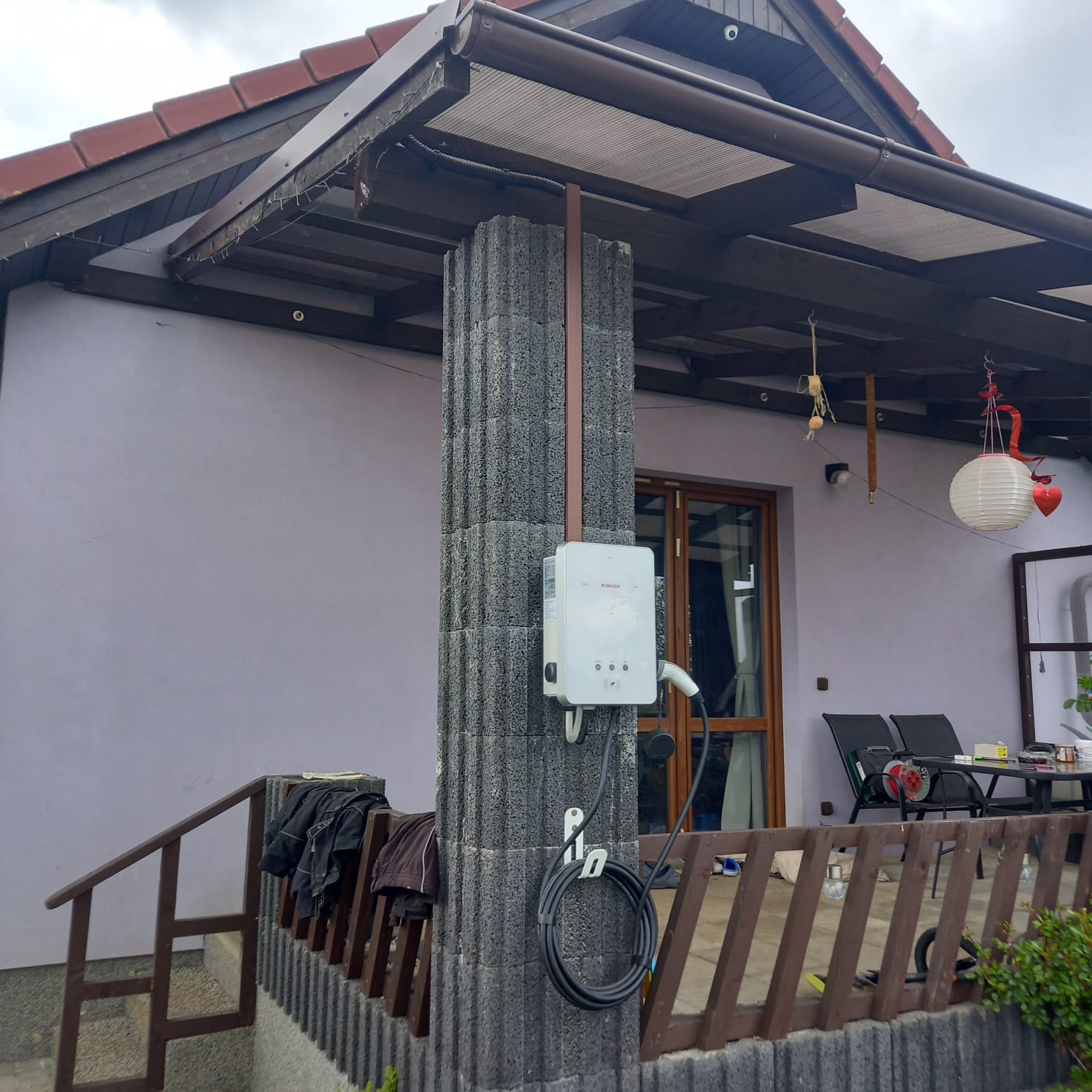 Instalace fotovoltaické elektrárny na sedlové střeše rodinného domu o výkonu 9,45 kW. Střídač 10 kW, bateriové úložiště o deklarované kapacitě 11,6 kWh a dobíjecí stanice pro elektromobily od značky DZD SOLAR.